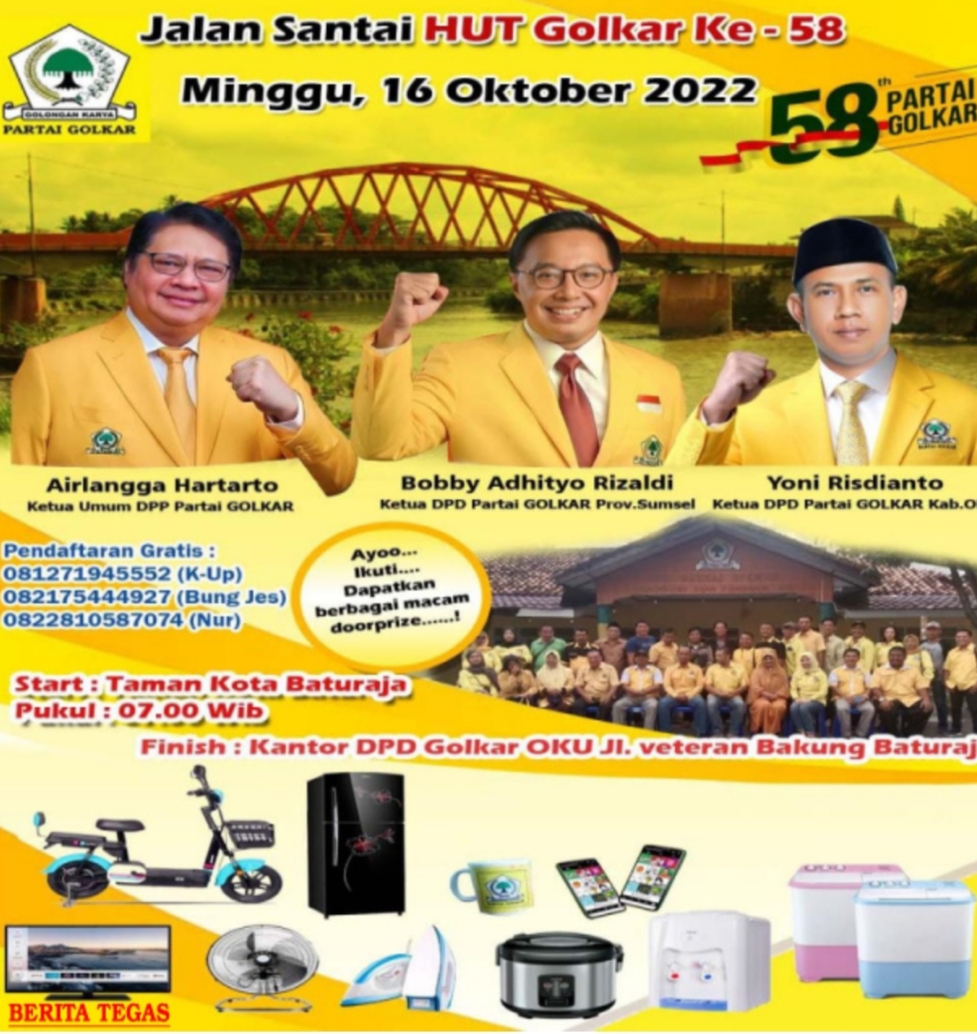 Ketua DPD Partai Golkar Kabupaten OKU, Yoni Risdianto menyampaikan, jalan santai HUT ke-58 Partai Golkar yang mengusung tema ‘Melangkah Bersama Partai Golkar”, akan diselenggarakan se-Indonesia pada tanggal 16 Oktober 2022 hari Minggu mendatang.